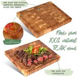 - JUICE GROOVE & HANDGRIP: This teak cutting board measures 17 x 13 x 1.5 inches, sturdy enough for any cutting jobs in your kitchen. A deep built-in juice groove allows it to catch excess liquid, ensuring your counters stay clean. Side handles help you lift and move the cutting board around easily.