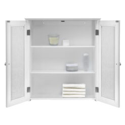 The Connor Removable Wall Cabinet features two water textured glass panel doors in a white finish. The cabinet’s classic design offers ample storage. The cabinet features three adjustable shelves that are ideal for storing items. The double plated door knobs add a charming touch. This cabinet comes with assembly hardware.