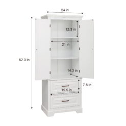 - Extra stability: The linen cabinet includes an anti-tipping hardware that assures the tall standing cabinet doesn’t fall over easily. Creating extra stability and guarantees safety to you and the items put in the cabinet.