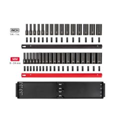 - 34-pieces, 3/8 in. drive deep 6-point impact sockets: 1/4, 9/32, 5/16, 11/32, 3/8, 7/16, 1/2, 9/16, 5/8, 11/16, 3/4, 13/16, 7/8, 15/16, 1 in., 6, 7, 8, 9, 10, 11, 12, 13, 14, 15, 16, 17, 18, 19, 20, 21, 22, 23, 24 mm
