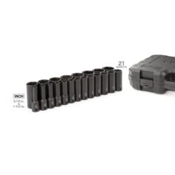 - 21-pieces, 1/2 in. drive deep 6-point impact sockets: 5/16 in., 11/32 in., 3/8 in., 7/16 in., 1/2 in., 9/16 in., 5/8 in., 11/16 in., 3/4 in., 13/16 in., 7/8 in., 15/16 in., 1 in., 1-1/16 in., 1-1/8 in., 1-3/16 in., 1-1/4 in., 1-5/16 in., 1-3/8 in., 1-7/16 in., 1-1/2 in.