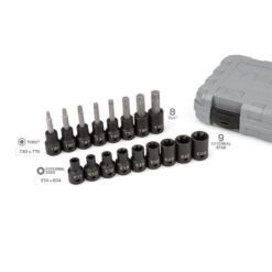 - 8-piece 1/2 in. drive torx impact bit sockets: T30, T40, T45, T47, T50, T55, T60, T70