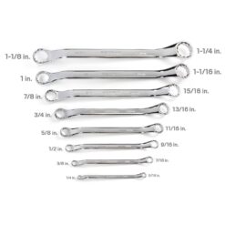 - 8-piece 45° offset box end wrenches (inch): 1/4 in. x 5/16 in., 3/8 in. x 7/16 in., 1/2 in. x 9/16 in., 5/8 in. x 11/16 in., 3/4 in. x 13/16 in., 7/8 in. x 15/16 in., 1 in. x 1-1/16 in., 1-1/8 in. x 1-1/4 in.