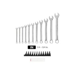 The TEKTON 11-piece. Combination Wrench Set is a complete inch set with every size from 1/4-3/4 in. Open end is angled 15° and the box end is designed to grip flat sides of fastener heads, not corners, to prevent round-off. Set comes with Modular Slotted Organizers, allowing you to customize your wrench organization system.