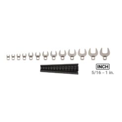 - 13-piece 3/8 in. drive crowfoot wrenches: 5/16 in., 11/32 in., 3/8 in., 7/16 in., 1/2 in., 9/16 in., 5/8 in., 11/16 in., 3/4 in., 13/16 in., 7/8 in., 15/16 in., 1 in.