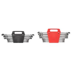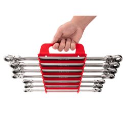 Each TEKTON long ratcheting flex head wrench is permanently marked with both a high-visibility laser marking and a stamped marking for easy size identification. The 12-point box end fits multiple types of fasteners including 6-point, 12-point, and square. The flex head sweeps smoothly through 180° without any set positions. This allows the wrench to operate at any angle and navigate around obstructions in its swing path, and the longer length offers added reach and increased leverage. The wrench is abrasive-blasted to create a finely textured finish and then plated with a trivalent chrome process, ensuring that the finish won’t flake off or corrode over time. This set includes a portable low profile wrench holder with space-saving folding handles and nonslip grippers to lock in wrenches.