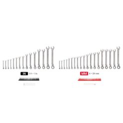- 19-piece, metric reversible ratcheting combination wrenches: 6 mm, 7 mm, 8 mm, 9 mm, 10 mm, 11 mm, 12 mm, 13 mm, 14 mm, 15 mm, 16 mm, 17 mm, 18 mm, 19 mm, 20 mm, 21 mm, 22 mm, 23 mm, 24 mm