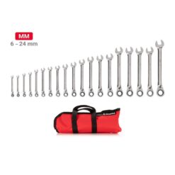 - 19-piece, reversible ratcheting combination wrenches: 6 mm, 7 mm, 8 mm, 9 mm, 10 mm, 11 mm, 12 mm, 13 mm, 14 mm, 15 mm, 16 mm, 17 mm, 18 mm, 19 mm, 20 mm, 21 mm, 22 mm, 23 mm, 24 mm