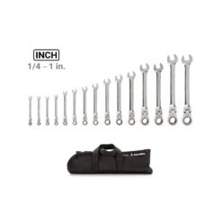 - 15-piece, flex head ratcheting combination wrenches: 1/4 in., 9/32 in., 5/16 in., 11/32 in., 3/8 in., 7/16 in., 1/2 in., 9/16 in., 5/8 in., 11/16 in., 3/4 in., 13/16 in., 7/8 in., 15/16 in., 1 in.