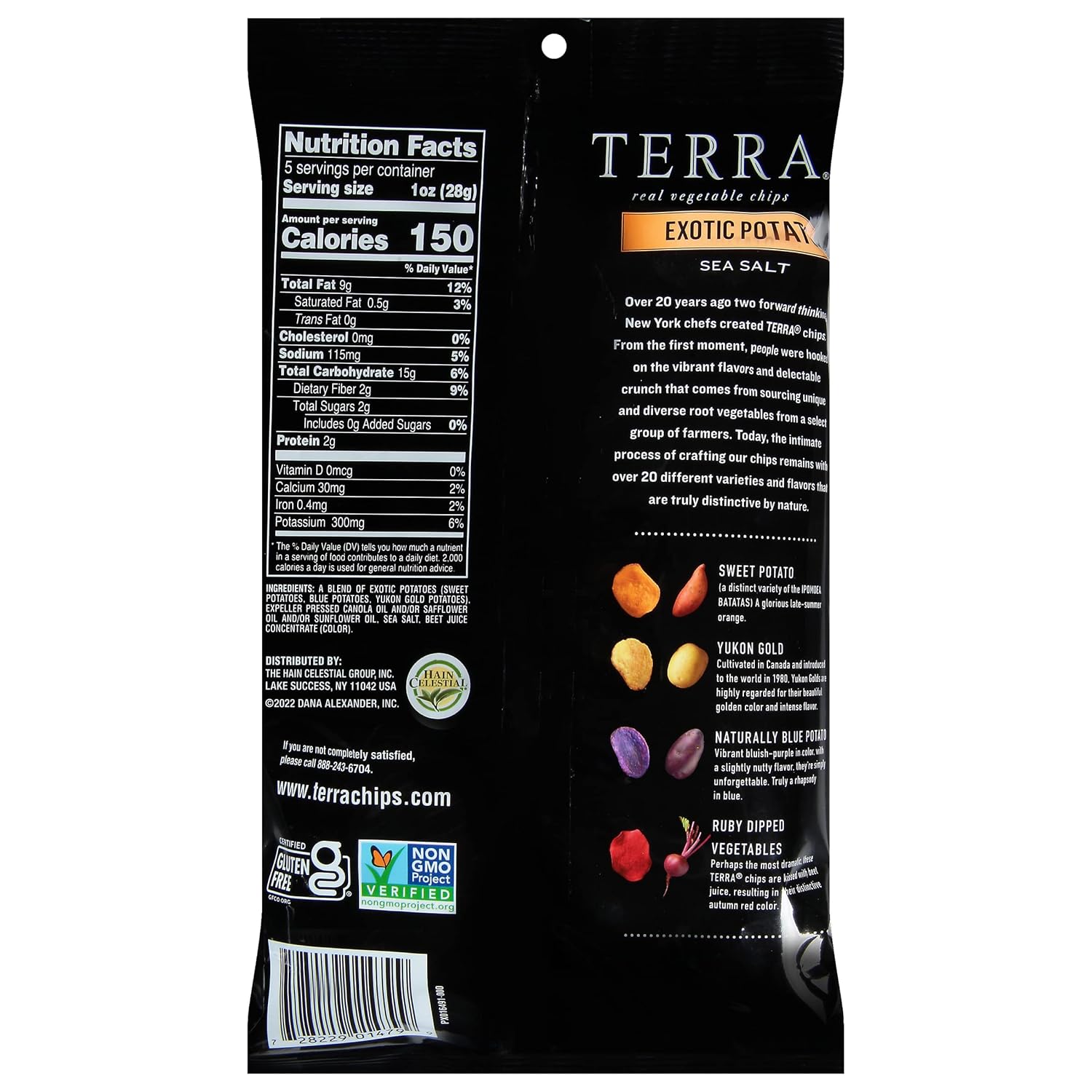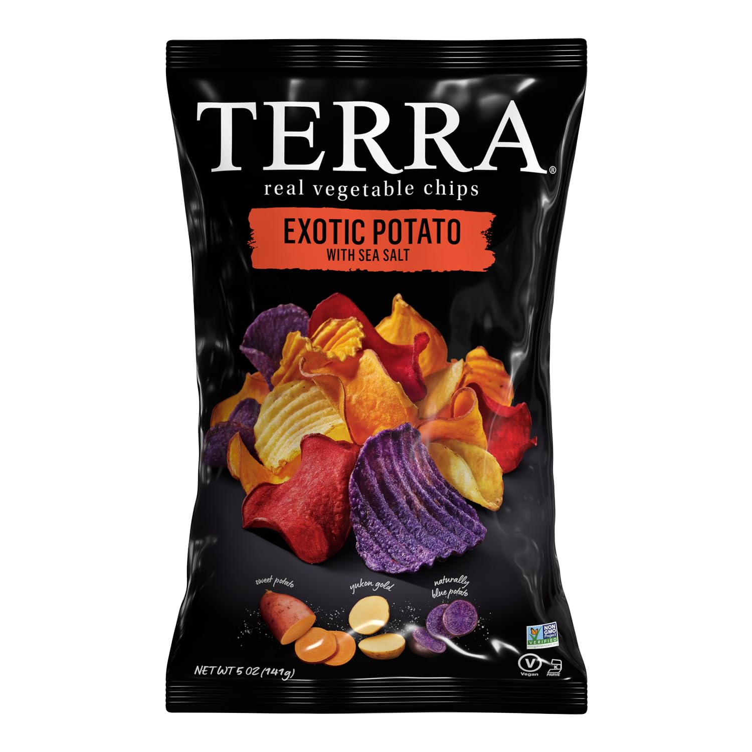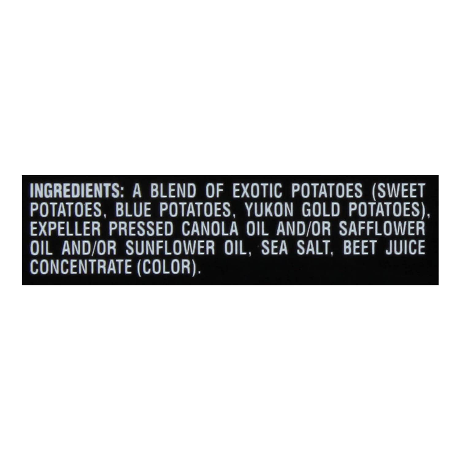 A Bend of Exotic Potatoes (Sweet Potatoes, Blue Potatoes, Yukon Gold Potatoes), Expeller Pressed Canola Oil and/or Safflower oil and/or Sunflower Oil, Sea Salt, Beet Juice Concentrate (Color).