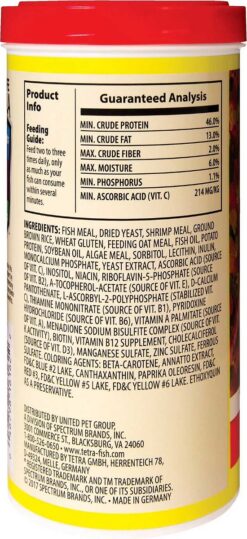 Bring out the best colors in your tropical fish with Tetra Color Tropical Flakes Fish Food. In the wild, tropical fish maintain their bright, vibrant colors through diet. But these colors can fade in an aquarium environment. Tetra Color Tropical Flakes Fish Food contains natural color enhancers including shrimp and algae and can be fed daily as a supplement to any diet. It contains vitamin C and Tetra’s patented ProCare blend to support immunity and won’t cloud water.