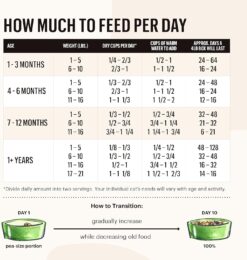 Adult Feeding Guidelines: Weight (lbs) Dry cups/day Water to Add 1-5 1/8 – 1/3 ¼ – ½ 6-10 1/3 – ½ ½ – ¾ 11-16 ½ – 1 ¾ – 1 ½ 17-21 1 – 1 1/8 1 ½ – 1 2/3 Gestation and Lactation Guidelines: Grain Free Chicken dehydrated recipe may be fed ad-libitum during growth, gestation or lactation. Kitten Feeding Guidelines: 1-3 Months 4-6 Months 7-12 months Weight (lbs.) Dry cups/day Water to Add Dry cups/day Water to Add Dry cups/day Water to Add 1-5 ¼ – 2/3 ½ – 1 1/4 – 2/3 ½ – 1 1/4 – ½ ½ – ¾ 6-10 2/3 – 1 1 – 1 ½ 2/3 – 1 1 – 1 ½ 2/3 – ¾ ¾ – 1 ¼ 11-16 —— 1 – 1 1/3 1 ½ – 2 1– 1 ¼ 1 ¼ – 2 – Standard 8 oz measuring cup (about 115g by weight).
