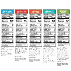 SEA SALT: Edamame (Soybean), Sea Salt, Soybean Oil. RANCH: Edamame (Soybean), Ranch Seasoning (Salt, Can eSugar, Garlic Powder, Maltodextrin, Onion Powder, Spices, Tomato Powder, Natural Flavors, Contains 2% of less of: Lactic Acid Powder, Citric Acid, Yeast Extract), Soybean Oil. WASABI SOY SAUCE: Edamame (Soybean), Wasabi Soy Sauce Powder (Sugar, Soy Sauce Powder (Fermented Soy Sauce, Acid Hydrolyzed Vegetable Protein Seasoning, Maltodextrin, Salt, Sugar, Caramel Colour, Disodium 5′-Ribonucleotide), Salt, Yeast Extract, Onion Powder, Spice, Ginger Powder), Soybean Oil, Wasabi Powder. SRIRACHA: Edamame (Soybean), Soybean Oil, Salt, Garlic Powder, Chili Powder, Sugar, Onion Powder, Pepper Extract, Sweet Pepper Powder, Citric Acid. BUFFALO: Edamame (Soybean), Buffalo City Roasted Wing Flavor (Cayenne Pepper, Distilled Vinegar, Garlic, Yeast Extract, Cane Sugar, Citric Acid, Paprika Extract, Natural Non-Dairy Butter), Soybean Oil