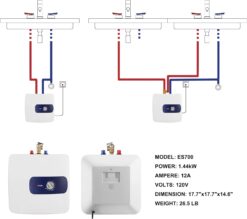 - Specifications and Warranty – Dimensions: 17.7″H x 17.7″W x 14.6″D; Weight:26.5lbs; Water connections: 1/2″ NPT, Electrical requirements: 1.44 kW at 120 volts, plug-in connection with 2 feet power cord; Max water pressure:150PSI; Nominal current: 12A. 3-year Limited Warranty for the tank, 1-year warranty for parts and 24hours customer service