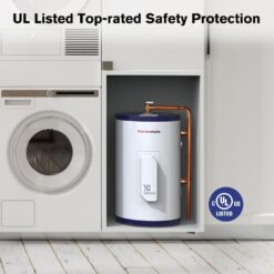 - 【10 Gallons point of use】 provide enough hot water for sink washing, dishwasher, washing machine or 10 – 15mins quick shower. Factory set temperature to 125°F. It can be adjusted between 90°F and 150°F through built-in thermostat