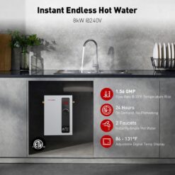 - [Instant Endless Hot Water] – Provide instant hot water wherever and whenever you need it. 24 hours standby. 8kW powerful heating support up to 2 faucets and large 1.56GPM at 35°F temperature rise. Max temperture up to 131°F. Requires Double Pole 40Amp breaker