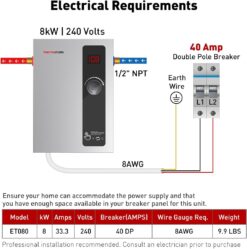 - [Easy Installation & Safety Protection] – ETL certified with overheating protection, auto stop heating when detecting no water, quality workmanship for leakage protection, 1/2 NPT side water connections, 8kW at 240V, 33.3A nominal current, 40AMP double pole breaker and 8AWG wires