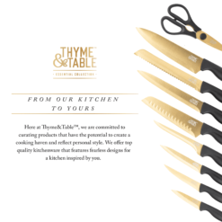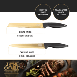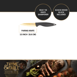 Thyme & Table 15-Piece Knife Block Set is a part of the Thyme & Table Essential Collection. Each knife is made of stainless steel with an ergonomic comfort grip. The knife block is made of Acacia wood and has a built-in knife sharpener. The 15-piece set includes: Stainless Steel Shears 8″ Chef Knife 8″ Bread Knife 8″ Carving Knife 7″ Santoku Knife 6″ Boning Knife 5″ Utility Knife Six 4.5″ Steak Knives 3.5″ Paring Knife
