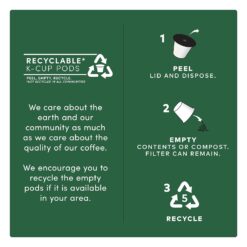 - Doing Our Part: We care about the earth and our community as much as we care about the quality of our coffee. We encourage you to empty the grounds of your used pods and recycle them if it is available in your area.