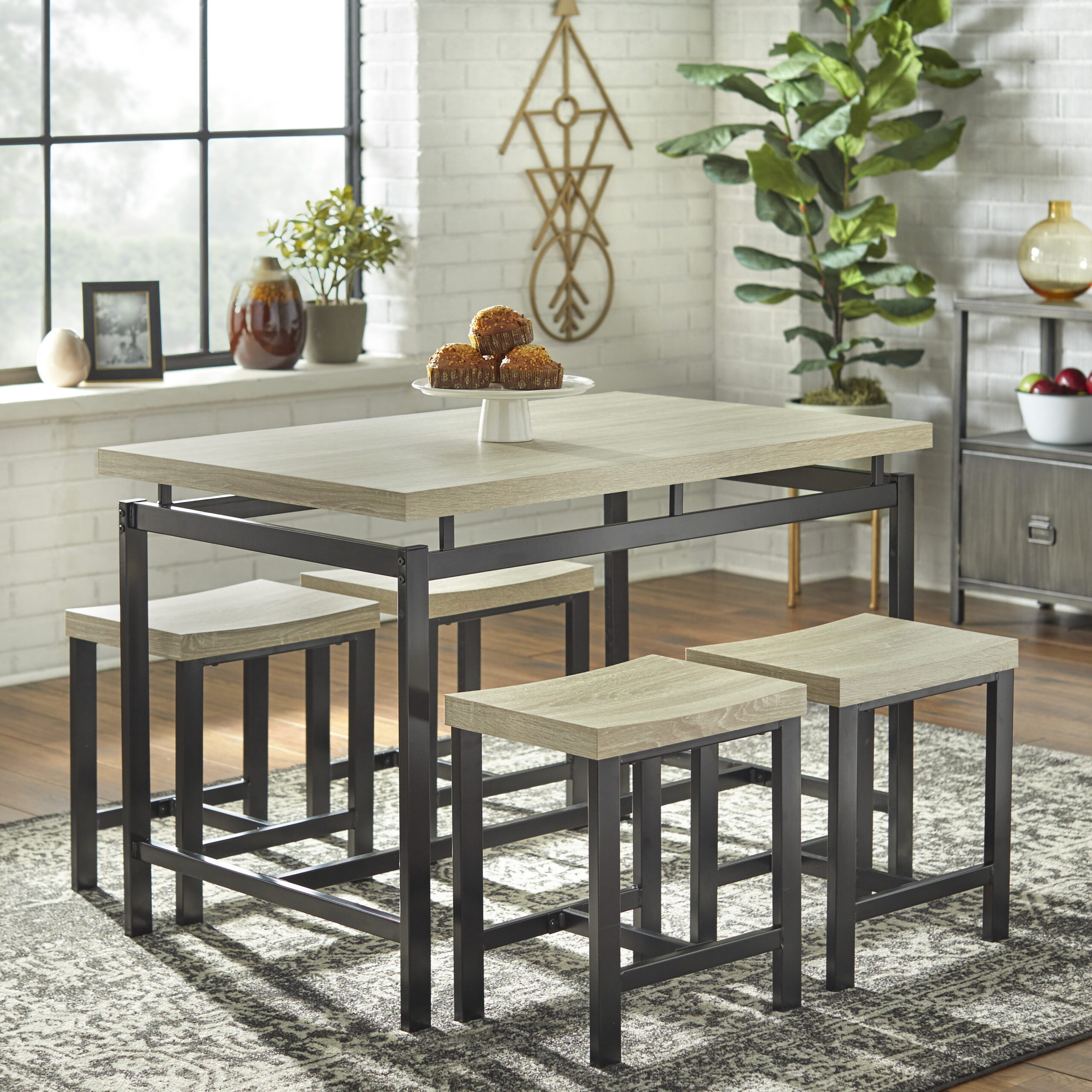 This attractive and contemporary 5-Piece Bowery Dining Set takes a modern twist on your home decor. The backless seating is captivating and can tuck neatly under the sleek table to conveniently keep it out of the way when not in use. This makes it ideal for use in smaller homes, apartments, and dorm rooms. Not only does this set work with any style, but it also creates a place for instant eat-in convenience. The 5-piece dining set in natural features metal frames in a black finish with particleboard and laminate. It is the ideal way to make the most of your breakfast nook, compact dining space, or even a work or craft room. The seats and tabletop all wipe clean, ensuring simple care and maintenance.