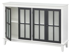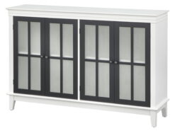 Highlight the charm of your dining room area with the Hampshire Two-Tone Buffet by TMS. This versatile buffet brings a modern touch to a classic farmhouse style. The two-tone MDF frame in white is styled with crown molding and accented with black window frame cabinet doors. Frosted tempered glass panels add an elegant touch creating a unique look. Generous space is provided to store your table linens and serving pieces with the adjustable shelf for varying sized items.