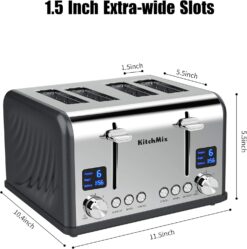 Toaster 4 Slice, Bagel Stainless Toaster with LCD Timer, Extra Wide Slots, Dual Screen, Removal Crumb Tray (Gray)