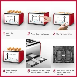 Toaster 4 Slice, Geek Chef Stainless Steel Extra-Wide Slot Toaster with Dual Control Panels of Bagel/Defrost/Cancel Function, 6 Toasting Bread Shade Settings, Removable Crumb Trays, Auto Pop-Up (Red)
