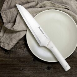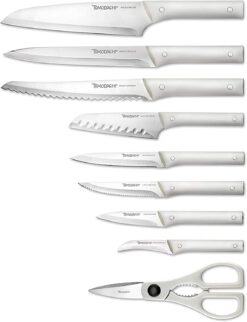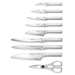 Function meets form with the Tomodachi Fuji Knife series featuring balanced weight and off-white handles. The exceptionally sharp, durable blades are secured by double-rivet construction for comfortable cutting. The textured, contoured handles provide comfort and a secure grip for effortless slicing, dicing and chopping. This essential set of knives and kitchen shears fit in an attractive black wood block.