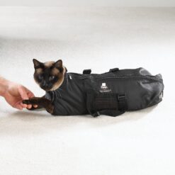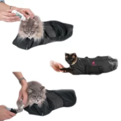 The Top Performance Cat Grooming Bag is a must have for bathing and grooming your feline friend. Constructed of heavy-duty black polyester with large rubber mesh inserts, this wearable bag lets water in and out when bathing for a scratch-free clean. The two front zippers allow for easy cleaning and nail clipping of the front paws, and the rear zippers allow for access to the rear paws and hindquarters. Simply wrap the bag around your kitty and zip the top opening to keep her secure and comfortable during an otherwise stressful grooming session.