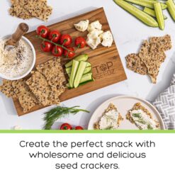 The Top Seedz 6 Seed Crackers are our flagship product. Each cracker is made with our special blend of all-natural seeds giving them that satisfying crunch no matter how you eat them. Dip them, top them, or eat them on their own, you’re sure to enjoy this healthy snack! Made using a proprietary seed mix, including sesame seeds, sunflower seeds, pumpkin seeds, flax seeds, chia seeds, arrowroot, and extra virgin olive oil, our Top Seedz crackers are certified organic and gluten free, nut free and grain free too! Top Seedz crackers provide a healthy and nutritious snack option that are also super tasty! These keto friendly vegan organic crackers are low in calories and packed with plant based protein, making them the perfect go-to snack for anyone, no matter your diet! Discover your new favorite snack by trying the Top Seedz Crackers with your choice of topping! Swiss cheese and a slice of dried salami, some sliced apple with your favorite nut butter, smoked salmon with a touch of cream cheese and a sprig of dill, and so much more! The possibilities are endless! What’s better than a simple pack of healthy, protein filled, gluten free, nut free, grain free, organic crackers? Why, six packs of course! With the six-pack of 5-ounce Top Seedz Crackers containers, you can share the deliciousness with your friends at a party, on a hike, or just have even more for yourself!