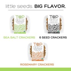 Top Seedz Mixed Pack of Seed Crackers with Rosemary, Sea Salt, and 6 Seed has our 3 Best Selling flagship flavors so you don’t have to pick a favorite. Each box is carefully baked with our proprietary blend of organic hulled seeds finished with a dash of seasoning to give them a delicious flavor and crispy crunch no matter how you eat them. Dip them, top them, or eat them plain, you’re sure to enjoy these healthy snacks! Made using a premium seed mix of sesame seeds, sunflower seeds, pumpkin seeds, flax seeds, cornstarch, extra virgin olive oil, and sea salt, our Top Seedz crackers are certified organic, gluten-free, vegan, nut free, and kosher. Our 6-seed cracker is grain free too, using arrowroot! Top Seedz crackers provide a sugar free, zero cholesterol, healthy, and nutritious snack option that is also super tasty! These gluten-free, vegan, organic, seed crackers are low in calories, a source of plant protein, iron, fiber, potassium, and magnesium, making them the perfect grab-and-go snack for on the road, at home, work, or on your next camping adventure. Kids love them too! Discover your new favorite snack and try Top Seedz Crackers with your choice of cheese, hummus, salsa, vegan queso, and so much more! The possibilities are endless! What’s better than a simple pack of healthy, delicious, organic, gluten-free, nut free, vegan, kosher, seed crackers? Why, six packs of course! With the six-pack of 5-ounce Top Seedz Crackers containers, you can share the deliciousness with your friends at a party, on a hike, or just have even more for yourself!