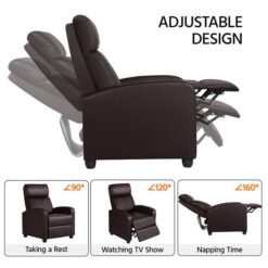 Three relaxation modes: You can enjoy your favorite sitting positions on this adjustable reclining chair, no matter you prefer sitting up straight or with your legs up or lying flat. By a simple pushing at the backrest, the footrest instantly pops up and stops at any angle from 0 to 90 degrees.