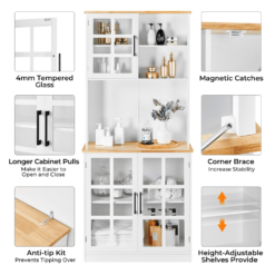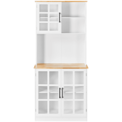 Made of CARB P2 MDF and vanished rubberwood, this freestanding storage pantry is durable and can hold up to 176lb. A water-resistant painting surface makes this storage cabinet oxidation-resistant and easy to clean. With 2 upper cabinets, 1 lower open cupboard, and a wide countertop, this storage kitchen buffet provides multi-purpose and ample storage space. For your storage convenience, the upper interior shelf behind the glass door and the lower cabinet shelf can be adjusted in the range of 7″/9.4″/12″ and 11.4″/14″/16.5″, respectively. Transparent tempered glass doors add more stylishness to this cabinet, making it easy for you to identify the items in the cupboards. We provide the necessary hardware and tools and step-by-step assembly instructions to help you set up this kitchen pantry without difficulties. Should you have any questions, please feel free to contact us!