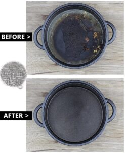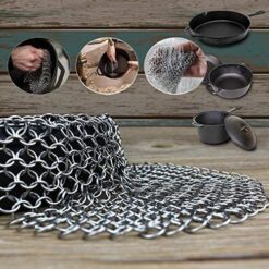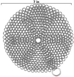 TOPULORS 316 Stainless Steel Cast Iron Skillet Cleaner Cast Iron Scraper Chainmail Scrubber for Cast Iron Pans, Pre-Seasoned Pans, Griddle Pans, BBQ Grills, and More Pot Cookware-Round 7 Inch Diameter. Our cast iron skillet cleaner applies premium grade never rusting stainless steel. It is built with soldered and handmade, which makes it durable and stronger.