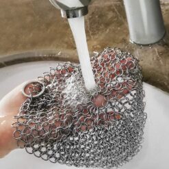- MULTIFUNCTIONAL: This chainmail multi-purpose scrubber can be ideally used for cast iron pans, skillets, glassware, pizza stones, plates, baking sheets, teapots, cookie sheets, cauldrons, camp chef griddles, tortilla press, waffle makers, pie pans, dutch ovens, griddles, woks, and casserole dishes.