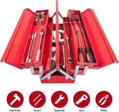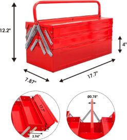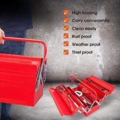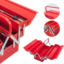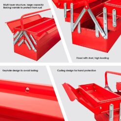 - HIGH CAPACITY.This steel tool box has 3 tiers and 5 trays for easy access to tools and parts. The small trays hold small parts such as wrenches, pliers, etc., and the large trays keep larger tools well organized.