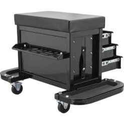 The rolling creeper seat allows you to work in your garage or workshop in comfort. This shop stool features a soft, fully padded vinyl-lined seat. Constructed with heavy-duty steel for stability and long-term durability, supporting up-to 350 lbs. 3 built-in, pull-out drawers allows for quick and easy access to your tools. Dual onboard side storage slots which can be folded when not in use, saving space. This mechanic stool creeper seat is equipped with (4) 360° swivel casters which deliver smooth and precise movements. Measures 26.5 in. L x 14.13 in. W x 13.74 in. H. Includes a limited 1-year manufacturer warranty.