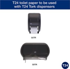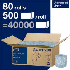 - 80 rolls, 500 sheets each, 2 ply. Advanced quality. Roll size L 156.3′. W 4.0″ Sheet length 3.8″ Core inner diameter 1.7″ Compatible with T24 dispensers.