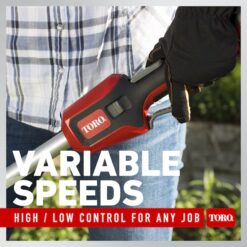 The Toro 60V Max 16-in Brushless String Trimmer (Battery manufacturer rating = 60V maximum & 54V typical usage. Actual voltage varies with load) lets you choose either 14-in of whippin’ or 16-in of whoopin’ which means you get to accelerate performance and productivity whenever you want. Unlike the other guys, ours comes standard with a pro-grade 0.095-in line that can handle the thickest grass and toughest weeds. You choose the speed that’s right for the job. Brushless motor with RunSmart onboard intel optimizes RPMs and torque in real time, for peak cutting performance in the toughest conditions. As part of the Toro 60V Max Flex-Force Power System, it’s got power like no other that commands a full line of tools. Count on it.