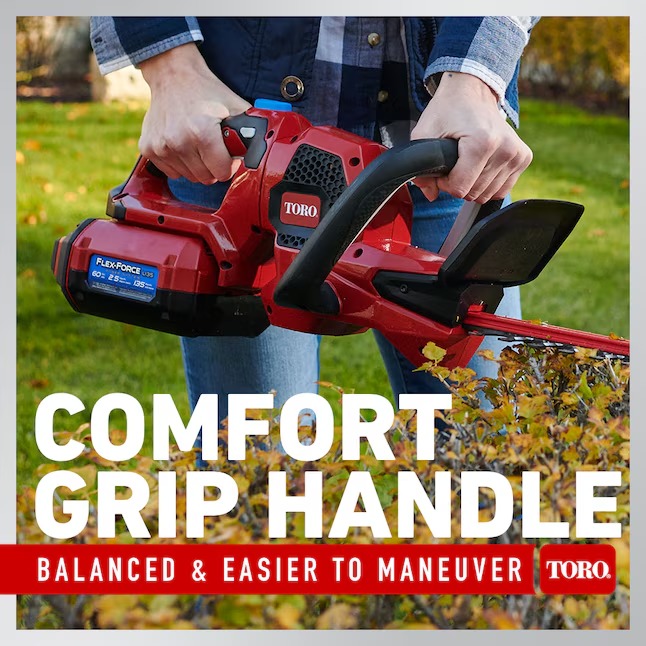 The Toro 60V Max 24-in Hedge Trimmer (Battery manufacturer rating = 60V maximum & 54V typical usage. Actual voltage varies with load) is two full feet of ferocious. Its powerful 60-volt maax motor cuts through branches like butter. Our exclusive blade design funnels branches in and keeps them there until they’re sliced, diced, and done. And its dual-action cutting bar makes you twice as effective. Need to switch from horizontal to vertical trimming? No problem. Just rotate it and rock it. For extra protection, a dual-sided safety is accessible in any of the cutting positions. As part of the Toro 60V Max Flex-Force Power System, it’s got power like no other that commands a full line of tools. Count on it.