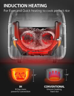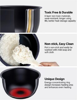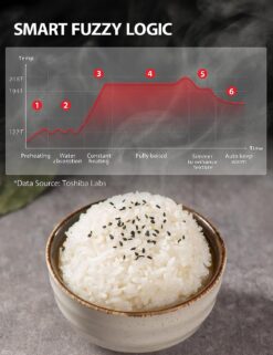 - Fuzzy Logic Rice Cooker – This Toshiba rice cooker 10 cup Cooked features induction heating and fuzzy logic to ensure precise cooking results. Induction heating heats the inner pot, while fuzzy logic technology uses sensors to monitor and adjust the temperature and cooking time based on the ingredients and cooking mode selected. This combination results in perfectly cooked rice, soup, and other dishes with optimal flavor and texture