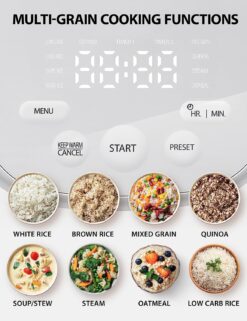- Multi-Function – This large rice cooker has 8 cooking functions: Low Carb, Quick Rice, White Rice, Brown Rice, Mixed Grain, Quinoa, Steam and Oatmeal. It cooks a variety of dishes including white rice, brown rice, sushi rice, mixed rice, quinoa, oatmeal, soup, stew, chili, sauté/simmer, and slow cook. It also steams vegetables, seafood, and more. Whether you’re a beginner or a seasoned chef, this rice cooker with steamer basket offers great versatility
