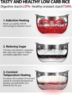 - Low Sugar Rice Cooker – This Asian Rice Cooker is a great option for people who are following a low-carb or keto diet. The LOW CARB setting can remove unhealthy digestive starch by up to 37% and increase healthy resistant starch by up to 34%. Note: LOW CARB function also works for brown rice and other grains