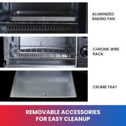 The Total Chef 4-Slice Toaster Oven offers multipurpose cooking in a compact countertop design, perfect for small kitchens, apartments, and dorm rooms. Toast bread, bake biscuits, grill chicken wings, and more in this 1000-watt unit with an easy-to-use timer and temperature control knobs. 4-Slice Toaster Oven unit comes with an aluminized baking pan, chrome wire rack, and crumb tray that is removable for easy cleanup. The Total Chef 4-Slice convection toaster oven features a wide temperature range of 200-450°F (93-232°C) to suit all your cooking needs. The 30-minute timer with automatic shut-off allows for precise and controlled toasting or the use of the Stay On function for longer cooking times. The upper and lower heating elements cycle on and off during the cooking process to maintain a consistent temperature throughout. 4-Slice Toaster Oven simple little appliance will quickly become one of your favorites!