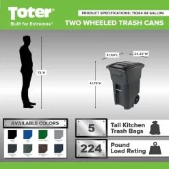 - The Toter bundle pack is exclusive to Lowe’s and includes 1 – 64 gallon black trash can, 1 – trash can odor eliminator, 2 – replacement fragrance packets, and 3 – 64 gallon cart liners.
