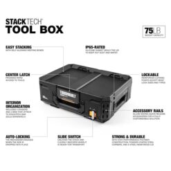 The StackTech Tool Box is a standard-capacity workhorse. It features an intuitive self-aligning top that allows StackTech boxes and totes to virtually stack themselves. An auto-locking interface ensures boxes seat securely, lock into place for transport, and easily unlock with a slide of the switch. A prominent lock indicator lets you know your Stack is safe to move without second guessing. Accessing tools is simple and intuitive with a one-handed center latch, standard to every size toolbox and organizer. Inside, you’ll find various bins and dividers along with grooves for 2 DIY dividers (not included) to help Pros stay organized and partition their space. Full customization is at Pros fingertips with tool-free, quick-release steel accessory rails. StackTech Tool Box is built for high-impact durability with armored corners, a steel-reinforced lid, and IP65 dust and water protection to ensure it can handle the toughest conditions. Dual locking points secure tools on and off the jobsite. The StackTech Tool Box is engineered for Pros to build a system unlike any other and customize it to the needs of every trade.