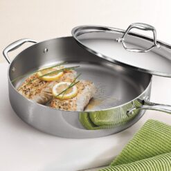 Along with sautéing, it can take on poaching brunch-worthy eggs, searing steaks and simmering hearty sauces with ease, as well as pan-frying your choice of fish and meats. Like the other selections in our Gourmet Tri-Ply Clad cookware collection, the 3 Qt deep sauté pan is made of premium 18/10 stainless steel, and heats evenly throughout, thanks to tri-ply clad construction. Ergonomic, riveted cast stainless steel handles are durable and provide easy maneuvering. The pan is also dishwasher-safe, oven-safe and compatible with all cooktops. With all of these key features, it’s clear why this pan belongs in any home or professional kitchen!