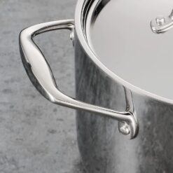 - Precision cast riveted handles and mirror-polished stainless-steel lid