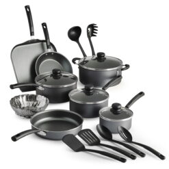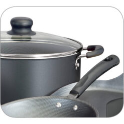 Tramontina’s PrimaWare 18-Piece Nonstick Cookware Set provides all the cookware essentials and is an excellent starter cookware set. The patterned interior nonstick coating ensures easy cooking and simple cleanup, while the heat- and shatter-resistant tempered glass lids allow quick monitoring of cooking progress.