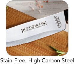 Stain-free, high-carbon steel serrated blades effortlessly slice through steaks and chops
